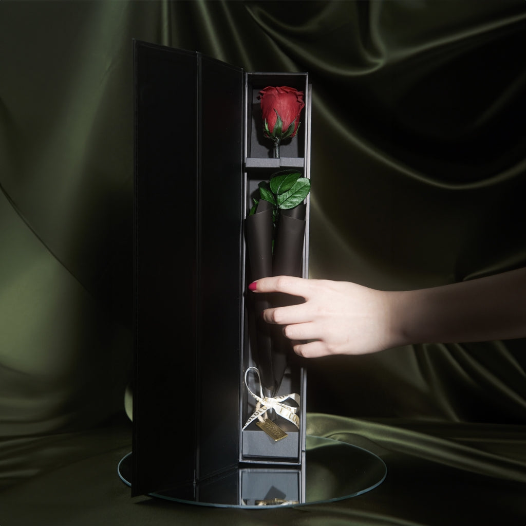 Taking cues from the overly indulgent we wanted to re-invent the experience of receiving a single rose. To represent the love with which one gifts a rose to their special ones, we wrapped La Vie En Rose in polished black paper. Packaged in a black gloss monogrammed case that looks like it could hold a bottle of expensive champagne.